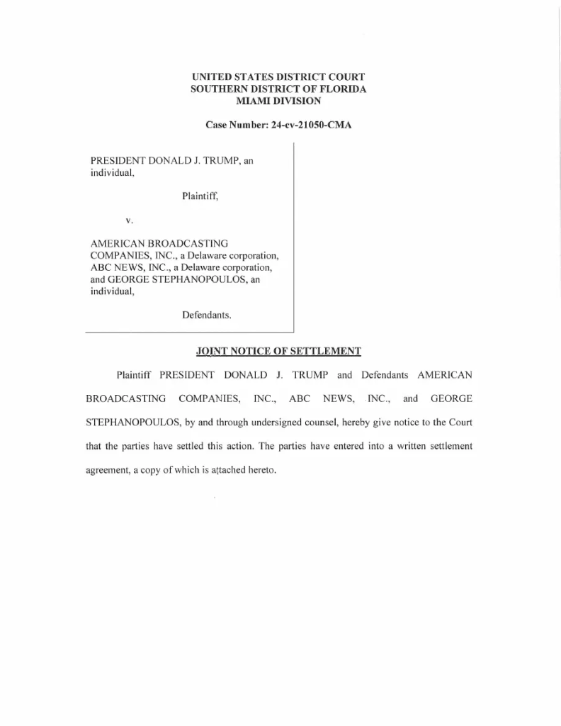 L’accord est intervenu après que la juge américaine Lisette M. Reid a récemment ordonné à Trump et Stephanopoulos d’assister à une audience de déposition en personne la semaine prochaine avant la date limite du 24 décembre pour que les accusés déposent une requête en jugement sommaire, afin d’éviter un procès.