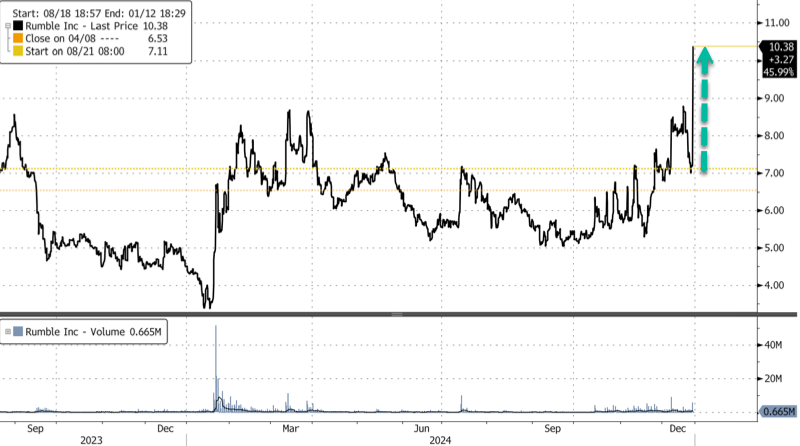 Les actions de Rumble sont en hausse de 43 % en pré-marché, se négociant autour de 10,30 $ l’action.