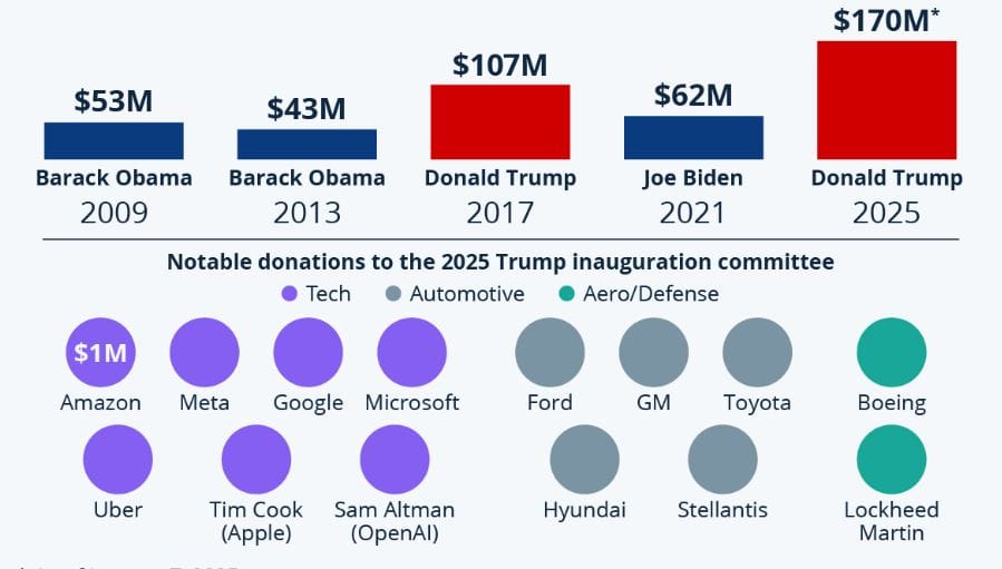 Les géants de la technologie Amazon, Meta, Google et Microsoft, ainsi que de nombreuses autres entreprises et les PDG d’Apple et d’OpenAI, ont largement contribué au fonds d’investiture de Trump pour tenter de s’attirer les faveurs ou du moins de ne pas se mettre du mauvais côté de l’homme connu pour être rancunier et ne pas reculer devant le favoritisme.