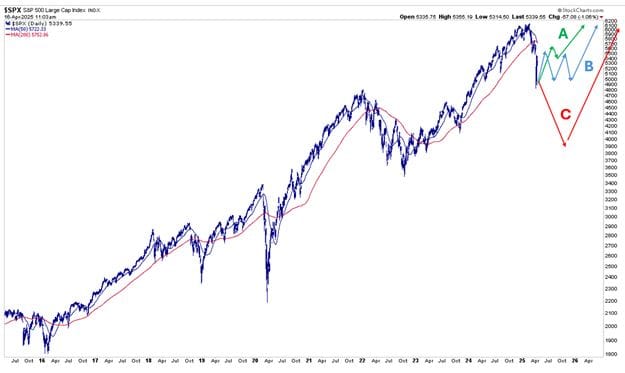 Le scénario C se déroulera probablement sous la forme d’une série de pics et de creux plus bas. Avec un peu d’optimisme, cela pourrait ressembler à 2022, comme illustré ci-dessous. Du sommet au creux, le S&P 500 a chuté de 28 %. Le récent pic-creux a été de 21 %. Ainsi, si ce scénario se déroule de manière similaire à celui de 2022, le niveau de 4 400 pourrait marquer le plus bas.