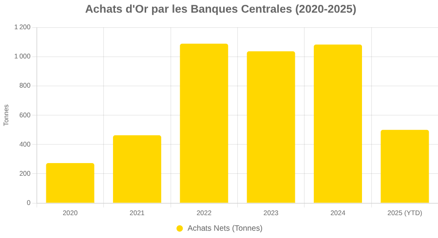 Voici un aperçu des achats nets de gold par les banques centrales ces dernières années, soulignant l’accélération en 2025.