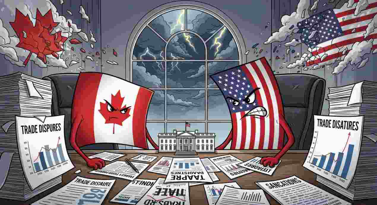 A tense 16:9 wide-angle illustration depicting U.S. President Donald Trump and Canadian Prime Minister Mark Carney facing off across a White House desk cluttered with trade documents and tariff charts, with stormy clouds and fractured flags in the background symbolizing escalating commercial tensions and high-stakes diplomacy.